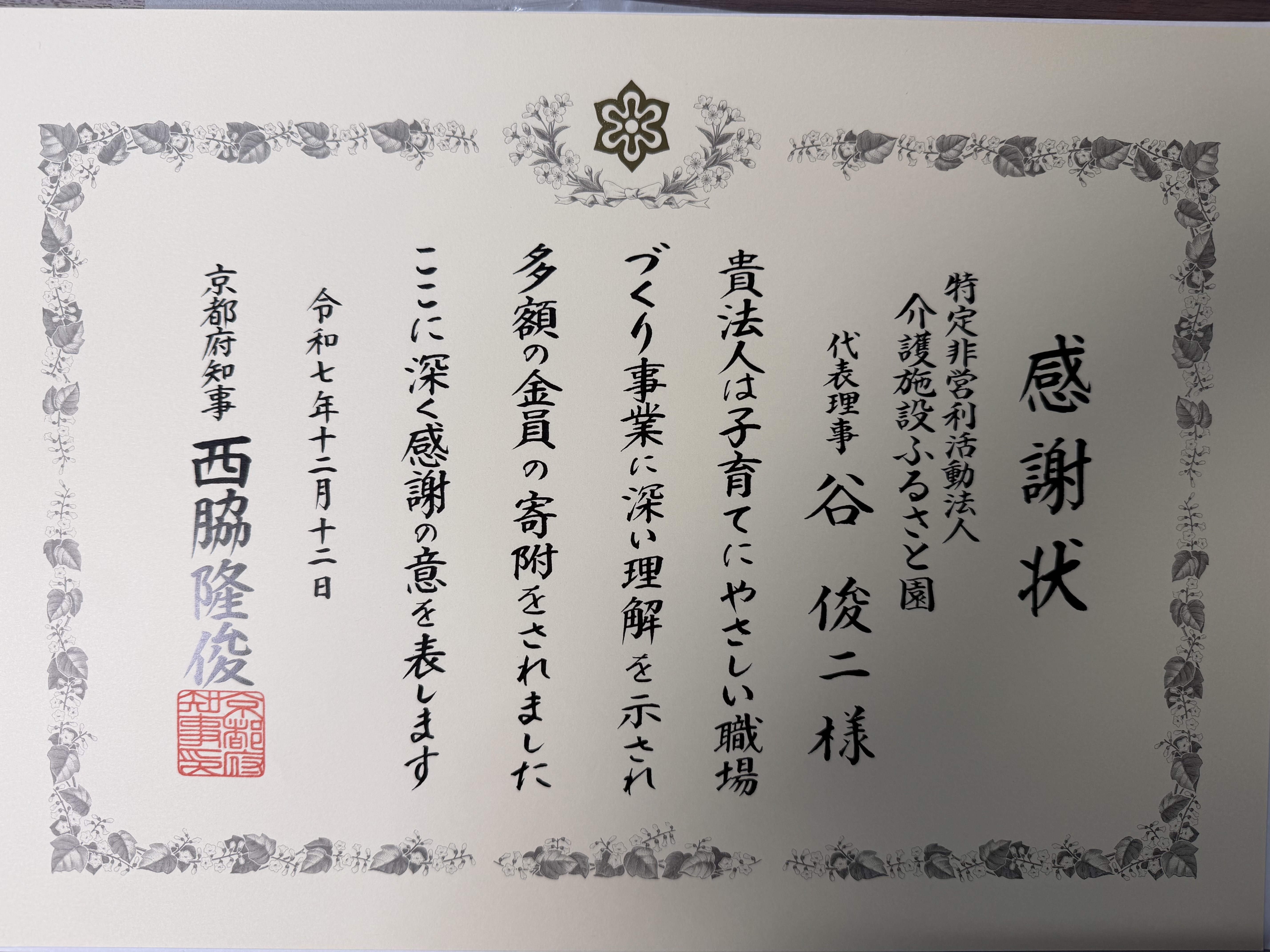 このたび、私たちは京都府に対して社会貢献活動の一環として寄付を行い、その感謝の証として京都府より感謝状を拝受いたしました。